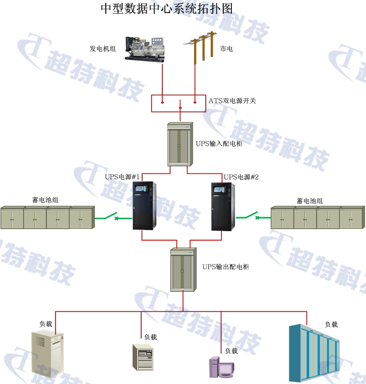 ????? 1、電源系統(tǒng),通常選用多路市電源互為備份,并且機房設(shè)有專用柴油發(fā)電機系統(tǒng)作為備用電源系統(tǒng),市電電源間、市電電源和柴油發(fā)電機間通過ATS(自動切換開關(guān))進行切換,為數(shù)據(jù)中心內(nèi)UPS(不間斷供電電源)、機房空調(diào)、照明等設(shè)備供電。